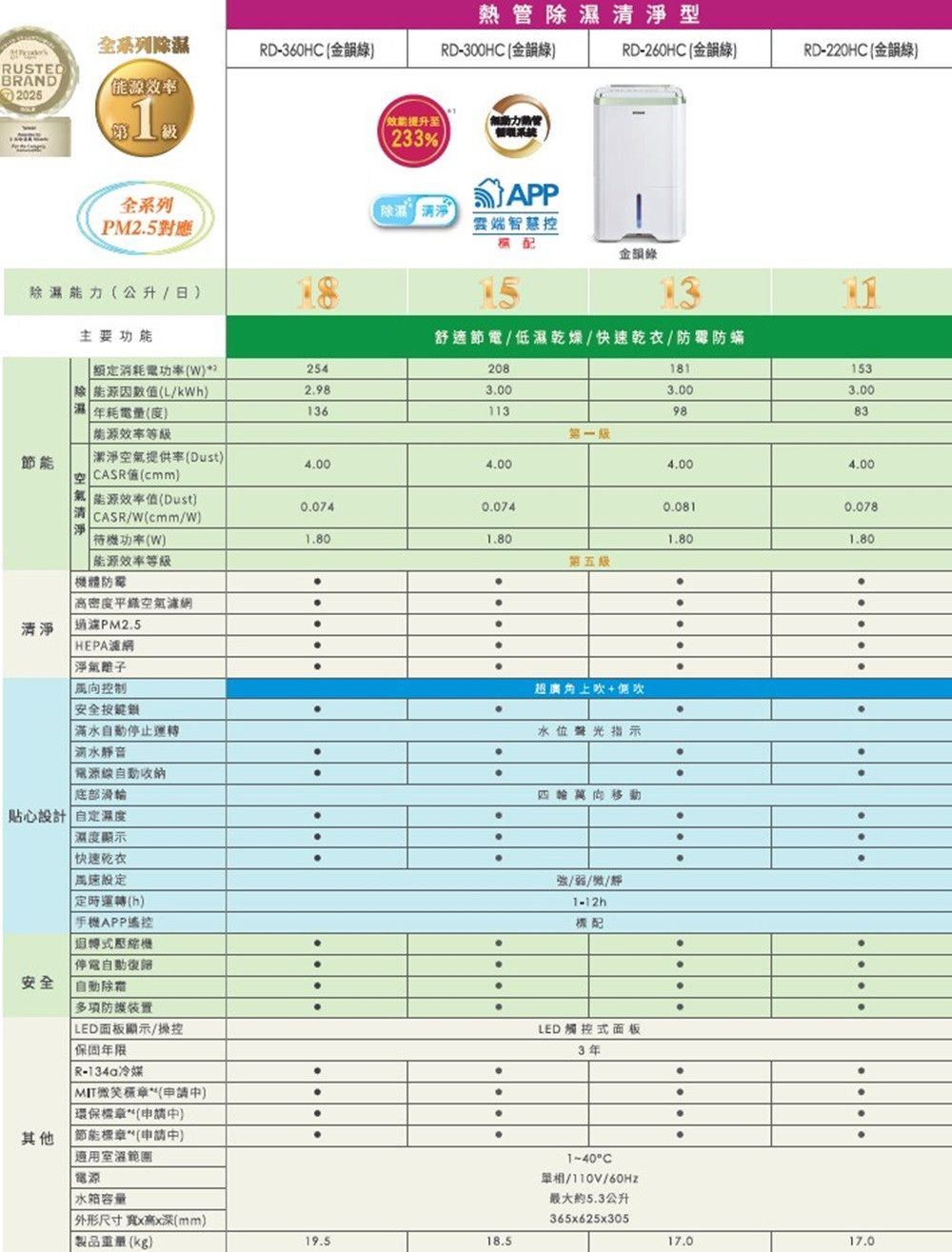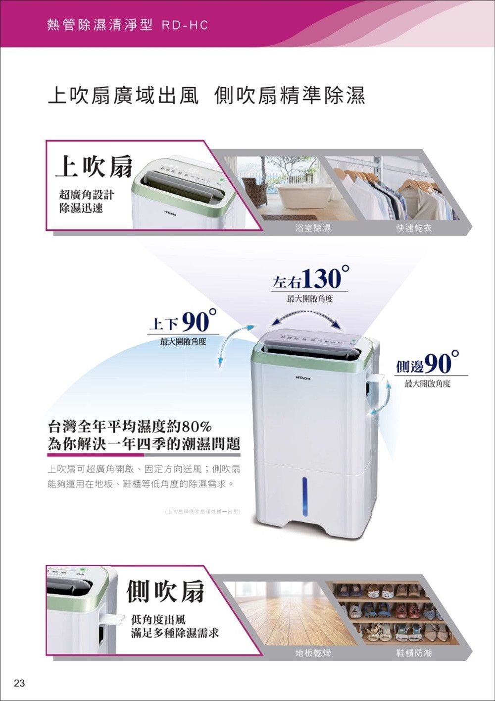 技術規格表:【HITACHI 日立】11公升熱管除濕清淨型除濕機RD-220HC金韻綠