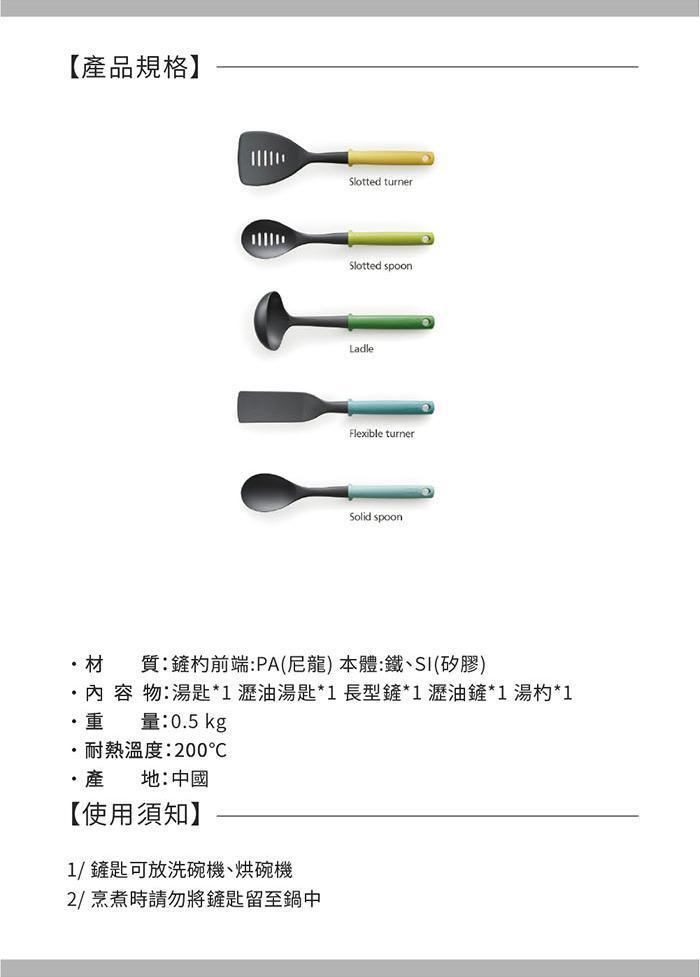 ◆包含五件不同用途的鏟杓,滿足各種烹飪需求。