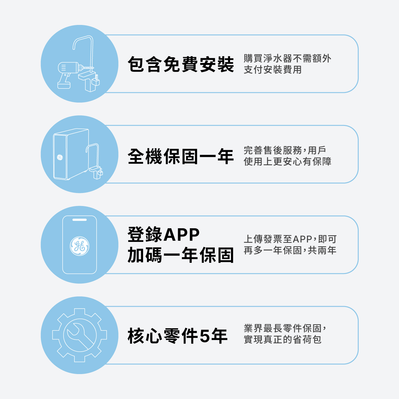 - 註冊APP並上傳購買證明即享延長保固(全機2年、核心部件5年)*,*核心部件係指水路板及加壓馬達。