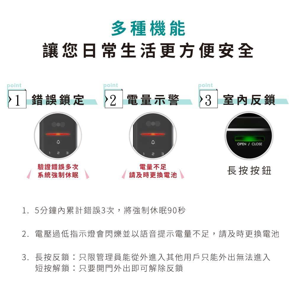 功能 語音提示、多層級功能表管理、低電量報警、防撬鎖報警、錯誤多次系統鎖定報警、兒童鎖、電子反鎖、日期時間查詢、音量調節、靜音、自動驗證