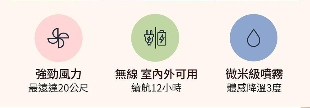 2)持久續航:12小時*續航力,持續吹送舒適涼風 (*在風速1,無噴霧時,可使用12小時)